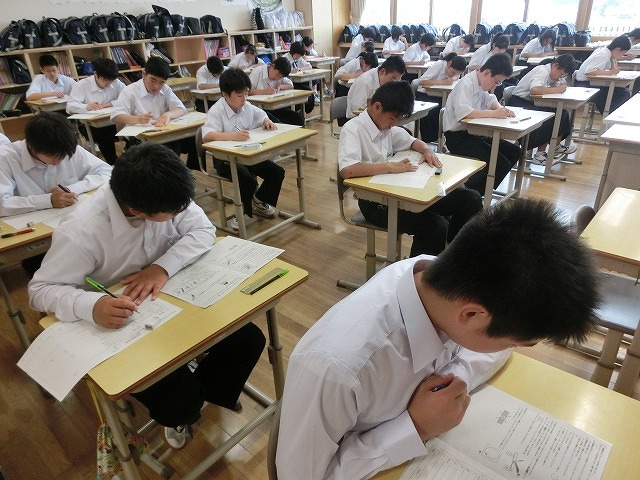 全学級、集中してテストに臨んでいます。画像は、上から1年1組~4組です。