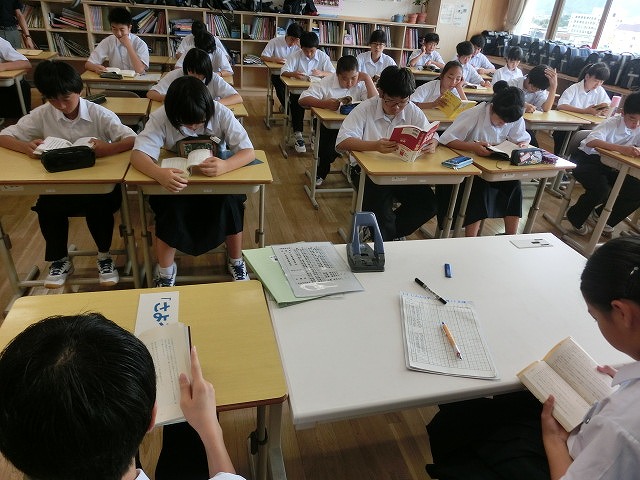平成31年4月8日(月)から始まった今学期が、残り4日間となりました。また、その日に入学した1年生は順調な学校生活を送っており、今日も落ち着いた雰囲気の中で朝読書をしていました。画像は、上から順に1年1組~4組です。